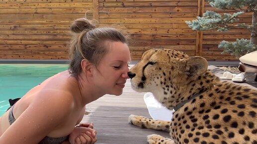 Завлекаем гепарда искупаться в бассейне. Но Герда готова только к солнечным ваннам.