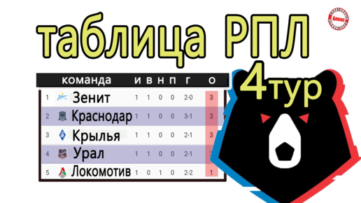 Чемпионат России по футболу (РПЛ). 4 тур. Результаты. Расписание. Таблица.