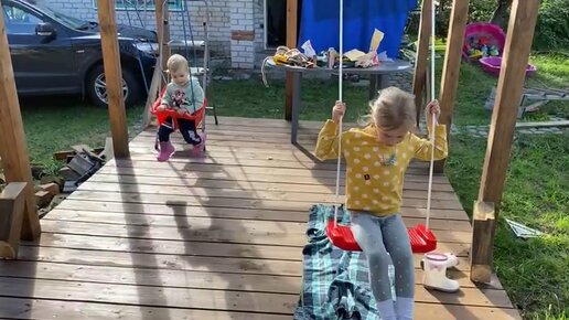 Беседка еще не закончена, зато качели уже сделали))