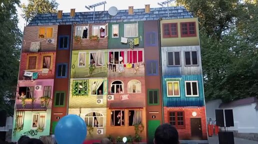 Фрагмент спектакля под открытым небом Ташкентского театра Ильхом с потрясающими декорациями-домом, в котором все жители дома поют песню