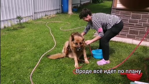 Моем овчарку в деревенских условиях на улице.