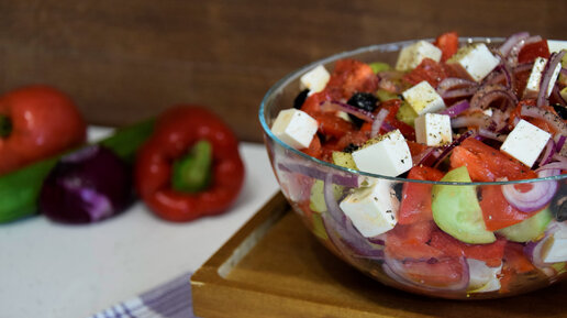 Рецепт греческого салата. Свежие овощи с сыром Фета, а также заправка из оливкового масла и лимонного сока! Салаты