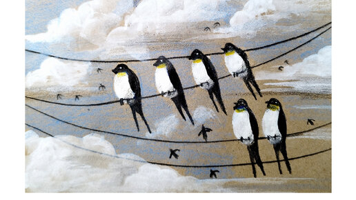 Ласточки. Рисунок гуашью и карандашами на крафтовой бумаге.