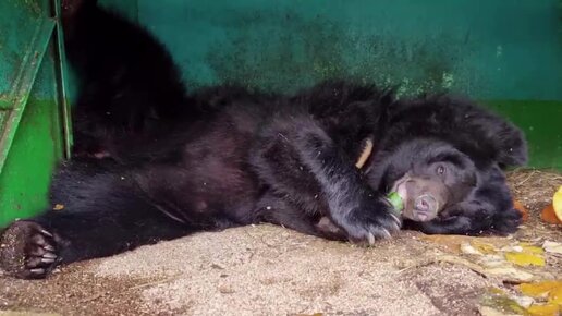 Гималайская медведица Волга тоже любит огурцы и может есть их в любом положении