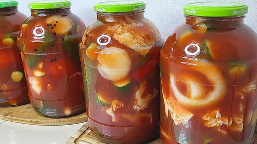 Просто заливаю томатном соком,закрываю по 10 банок,очень вкусный рецепт консервация на зиму "Ассорти" просто пальчики оближешь