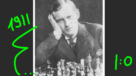 Молодой Алехин играет турнир в Карлсбаде, 1911. Партия за белых с победой против Эрика Кона в дебюте 3 коней с доигрыванием, 1-0