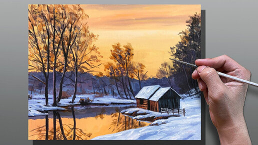 Рисуем домик на зимнем закате. Пейзаж. Живопись акрилом от Корреа Арт