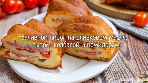 Просто залейте колбасу тестом. Заливной пирог на оливковом масле, с сыром, колбасой и помидорами.