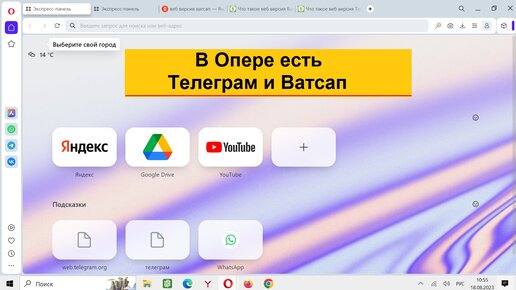 В браузере Опера есть значки Телеграм и Ватсап. Необходима синхронизация мессенджеров на компьютере и на телефоне