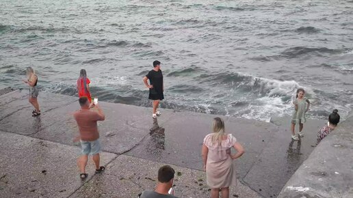 В Ялте отдыхающие фотографируются на фоне волны. Красиво, но опасно. Мокрые платья. Август, 2023