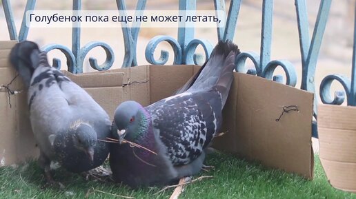 Голубенок мешает голубю-папе, который высиживает новых птенцов