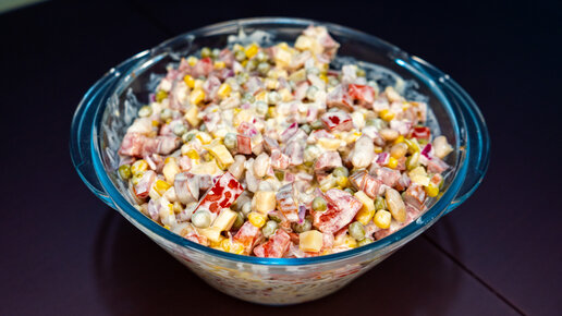 Салат с кукурузой, фасолью, помидором и колбасой | Салат три банки с колбасой и помидором