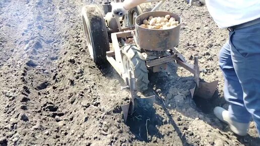 Посадка картошки самодельной картофелесажалкой