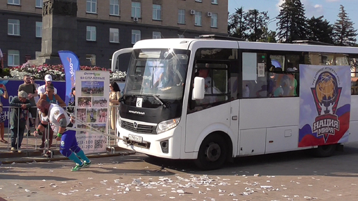 Спортсмен сдвинул с места автобус, площадь Ленина. Город Орёл. Фестиваль: Русское лето, 2023 год
