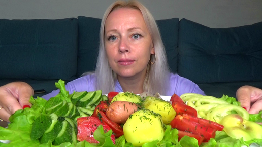 Мукбанг, и даже не кабачки. Картошка отварная с селедкой и сарделькой сырной. Овощи домашние сочные. Еда.