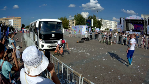 Спортсмен сдвинул с места автобус на площади, площадь Ленина. Город Орёл