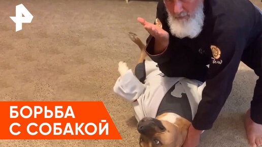 Тренер по джиу-джитсу отрабатывает приёмы на собаке