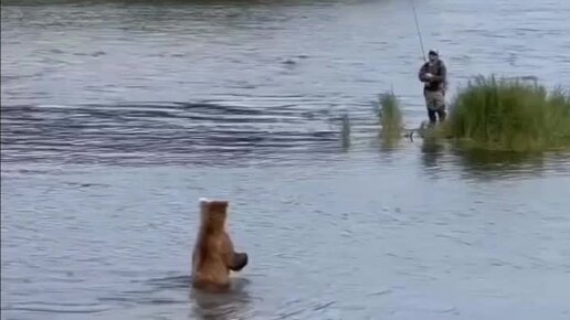 Когда медведь зашёл в реку, то рыбак поначалу растерялся...