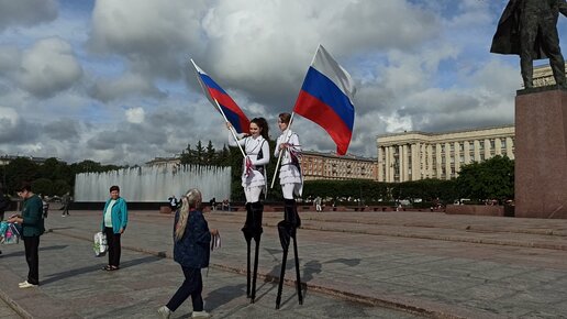 Прогулялась по Московской площади в Санкт-Петербурге. Девушка на ходулях подарила мне ленту