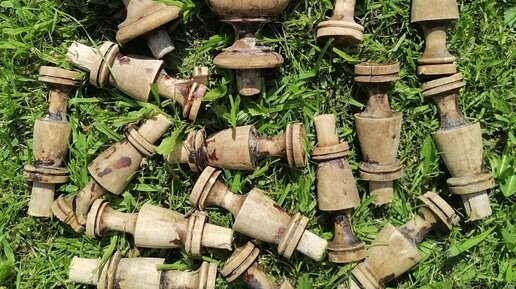 Реставрационная очистка токарных шишечек от старого лака хозяйственным мылом и Пемоксолью.