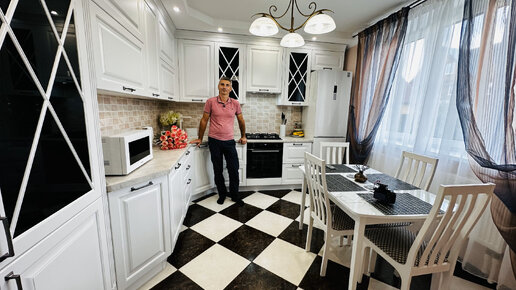 Белая классическая кухня в современном стиле и широким, высоким шкафом.