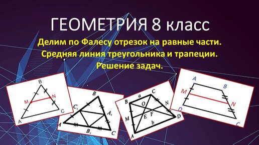 Геометрия 8 класс. По Фалесу делим отрезок на n равных частей. Средняя линия треугольника и трапеции. Решение задач.