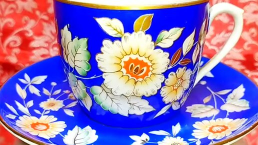 💙 Чайная пара Гибискус Песочное СССР Красивая советская посуда Фарфор Винтаж Soviet porcelain Blue tea cup & saucer Flowers USSR 🌺