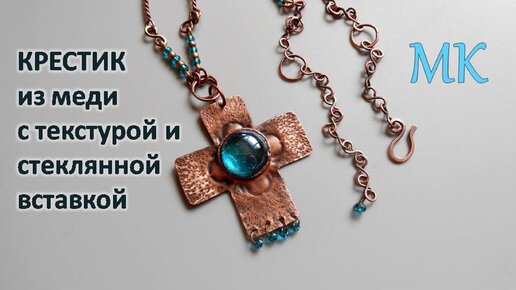 КРЕСТИК из меди с текстурой и стеклянной вставкой