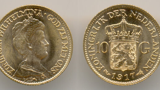 Нумизматика. Золотая монета. Нидерланды, 10 гульденов 1917 г.