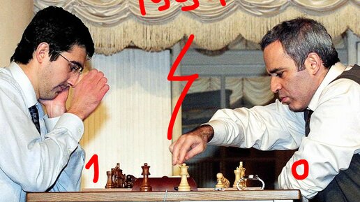 Крамник - Каспаров, 1994, 1-0, Москва, рапид. Два ученика школы Ботвинника встретились за шахматной доской. Вова Крамник оказался сильнее