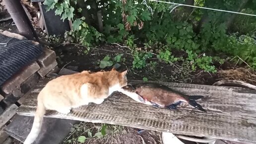 Рыжий котик пытается полакомиться здоровым лещем! Коты едят с головы!
