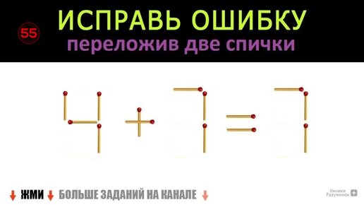 Головоломка со спичками 🥢 4+7=7 😎 Переложи две спички и получи верное равенство 👍