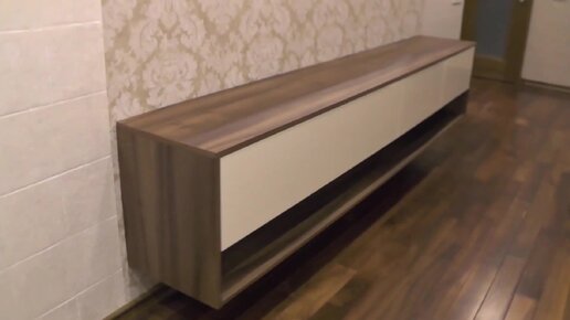 Подвесная тумба. Видео №1. Тумба без ручек. Фурнитура Блюм. Зеркало в раме на стене.
