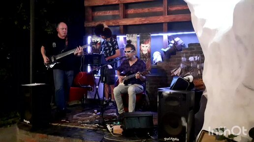 Студия Ом. Выступление музыкальной группы ВИА имени Шурфа Лонли-Локли. Композиция Горы-Реки. Гитара, бас и аналоговый синтезатор.