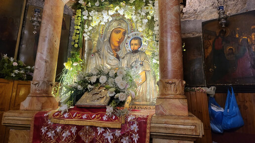 Это икона Богородицы Иерусалимской - главная икона Храма Успения Богородицы в Гефсимании. В Храме темно, но икона светится чудесным светом.
