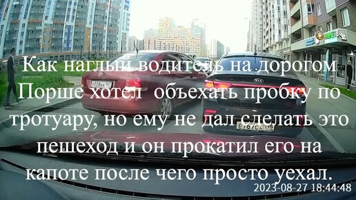 Как наглый водитель на дорогом Порше хотел объехать пробку по тротуару, но ему не дал сделать это пешеход и он прокатил его на капоте.