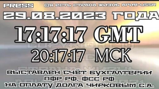 ВЫСТАВЛЕН СЧЁТ НА БУХГАЛТЕРИИ ПФР РФ ФСС РФ на оплату долга ЧИРКОВЫМ С.А. 29.08.2023 17:17:17 GMT