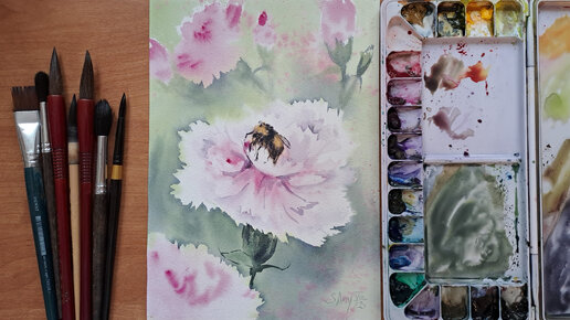 Рисуем цветы гвоздики и пчёлку акварелью.