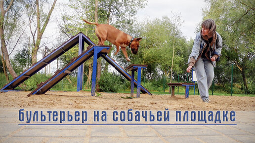 Мини бультерьер на новой собачьей площадке.
