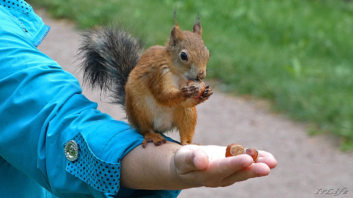 Осторожно белки!!! Решили с бельчонком поиграть, орешками угостить! А он...наглец..! Гатчинский парк.