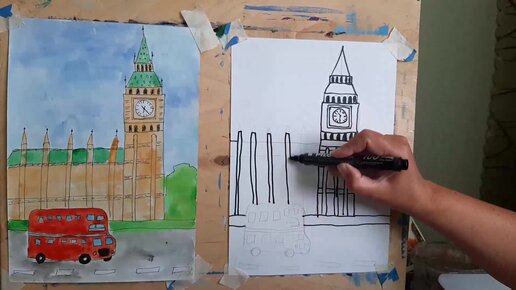 Рисуем путешествие в Лондон. Чёрный маркер, акварель