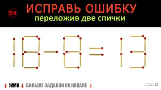 Математическая головоломка со спичками 🥢 18-8=13 😎 Исправь ошибку переложив две спички. Получи верное равенство ✔️