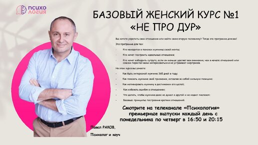 Телеканал «Психология» премьерные выпуски каждый день с пн-чт в 16:50 и 20:15 БАЗОВЫЙ ЖЕНСКИЙ КУРС №1 «НЕ ПРО ДУР»