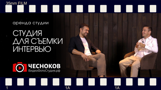 Многокамерная съёмка интервью в студии, два спикера в кадре.
