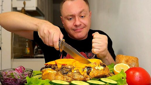 МУКБАНГ. ОБЖОР. СТЕЙК ИЗ СВИНОГО ОКОРОКА С ГРИБАМИ, ПОМИДОРАМИ И СЫРОМ. АСМР. МЯСО ПО-ФРАНЦУЗСКИ.