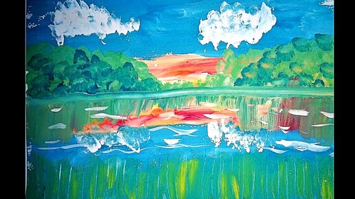 Рисуем закат над озером гуашью поэтапно для начинающих