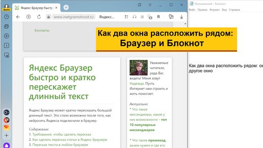Как два окна расположить рядом: Окно с браузером и окно с Блокнотом