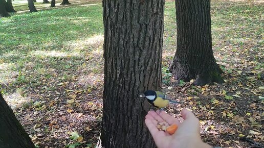 Наглые синицы объедают бельчонка. Получится ли у малыша добраться до орешков?