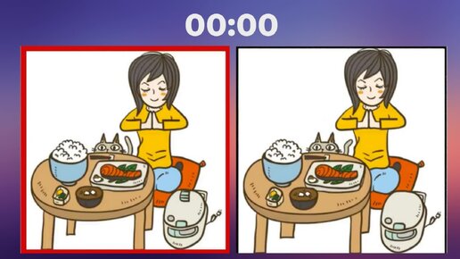 Девушка и кот готовятся к ужину. Найди три отличия на картинке.
