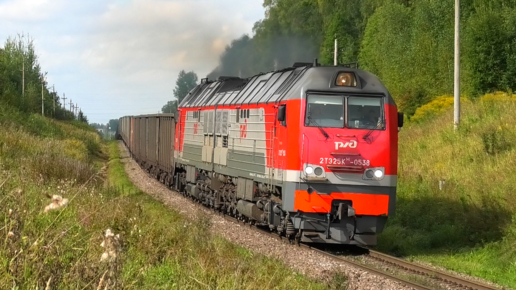 2ТЭ25КМ-0538 с грузовым поездом и приветливой бригадой